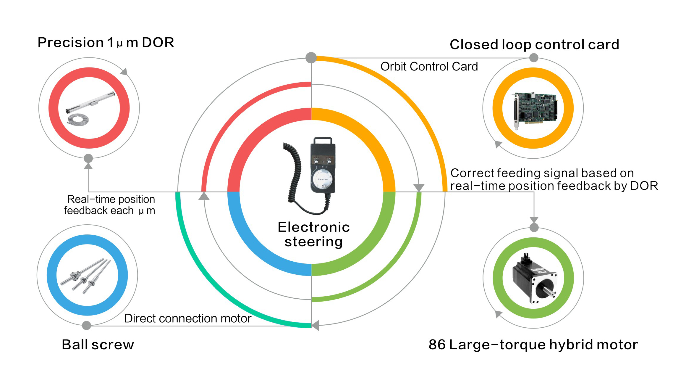 “Closed Loop Track Control System”. Grating ruler with 1um resolution assists the Posittec BSG Nanosecond feeding system. Track control precision up to ±2um.