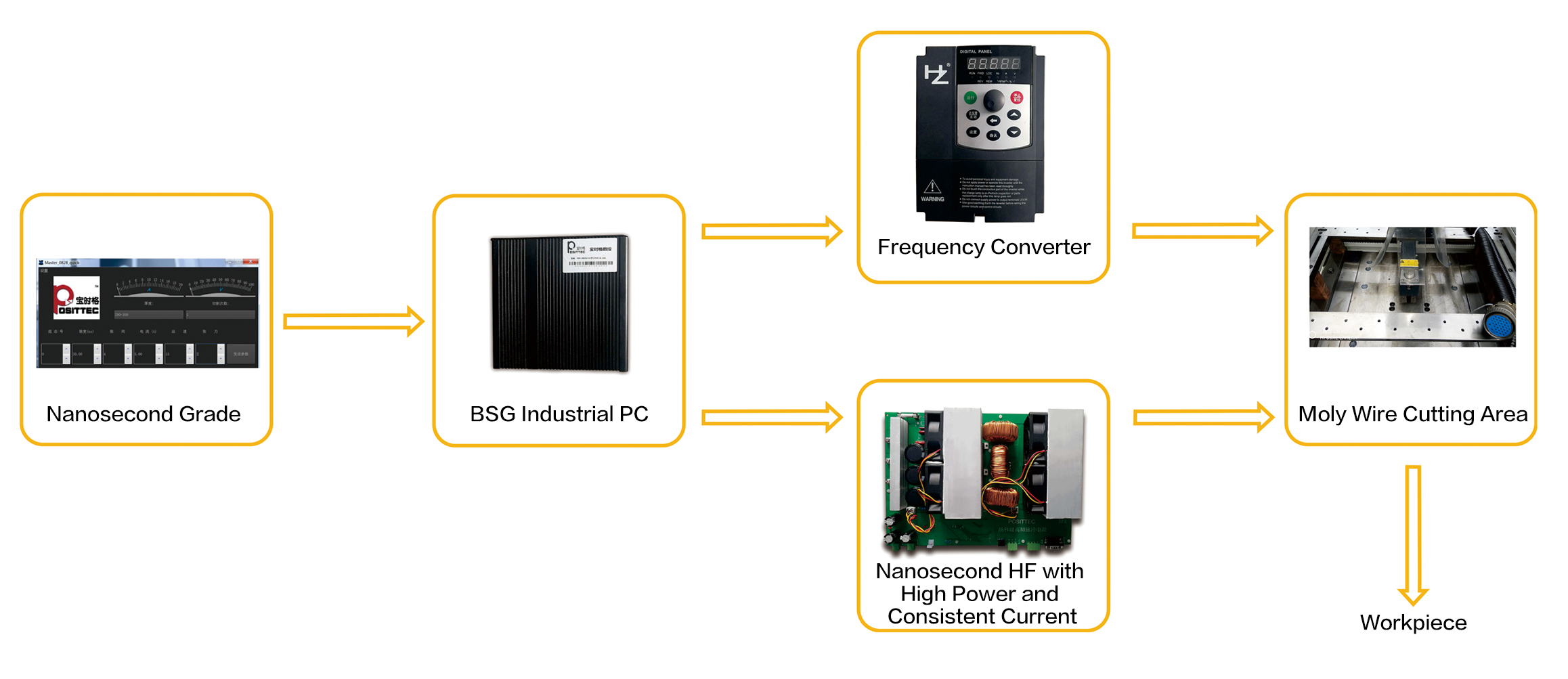 High Frequency Power and the Internal CircuitDigital high frequency power, the power generator is controlled by BSGXP software, which can improve the precision and the stability of the pulse signal and reduce the probability of the high frequency power failure, improve machining efficiency and the work piece quality Max Current 14A, cutting efficiency 400mm2/min,surface roughness up to 0.5um. The modular design concept is used in the internal wiring, which can reduce the risk of failure and make the maintenance easier.